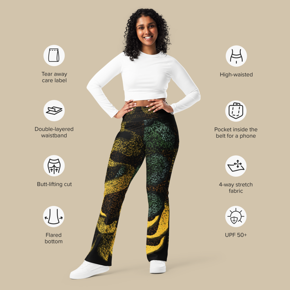 This design swells like a solar wave — layered with digital brushes and flowing gradients that radiate energy and motion. Solar Swell was created as a wearable current: bold, grounding, and meant to be in motion. These flare leggings are made to mirror your flow, whether you're stretching skyward or walking grounded steps through the world.